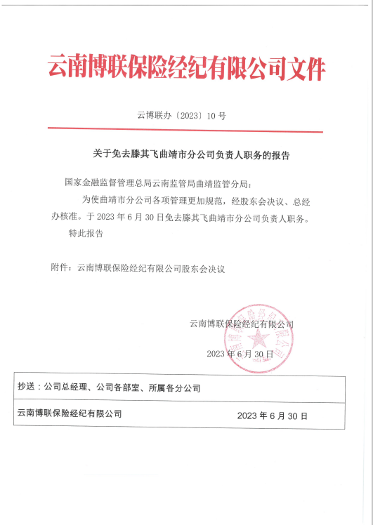 關于免去滕其飛曲靖市分公司負責人職務的報告